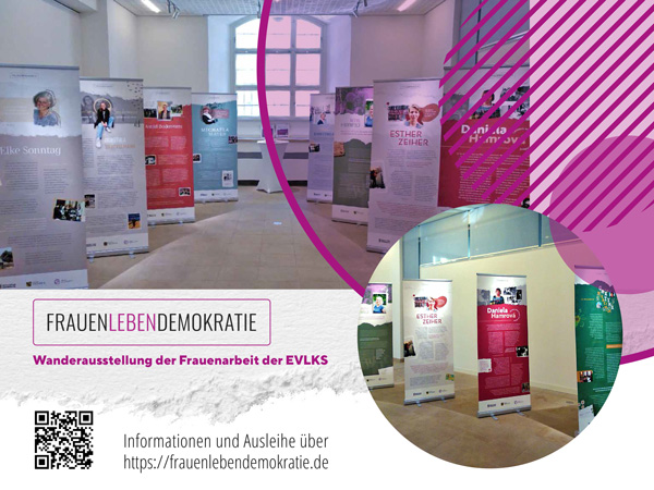 FrauenLebenDemokratie ist eine Wanderausstellung der Frauenarbeit der EVLKS, welche man auf Roll up banner oder im Internet betrachten kann. Die ausgewählten portraitierten Frauenbiografien aus Deutschland, Tschechien und Polen geben Impulse zur Auseinandersetzung mit Zeitgeschichte und mit individuellen Lebensbewältigungsstrategien aus der Perspektive und Erfahrung von Frauen.